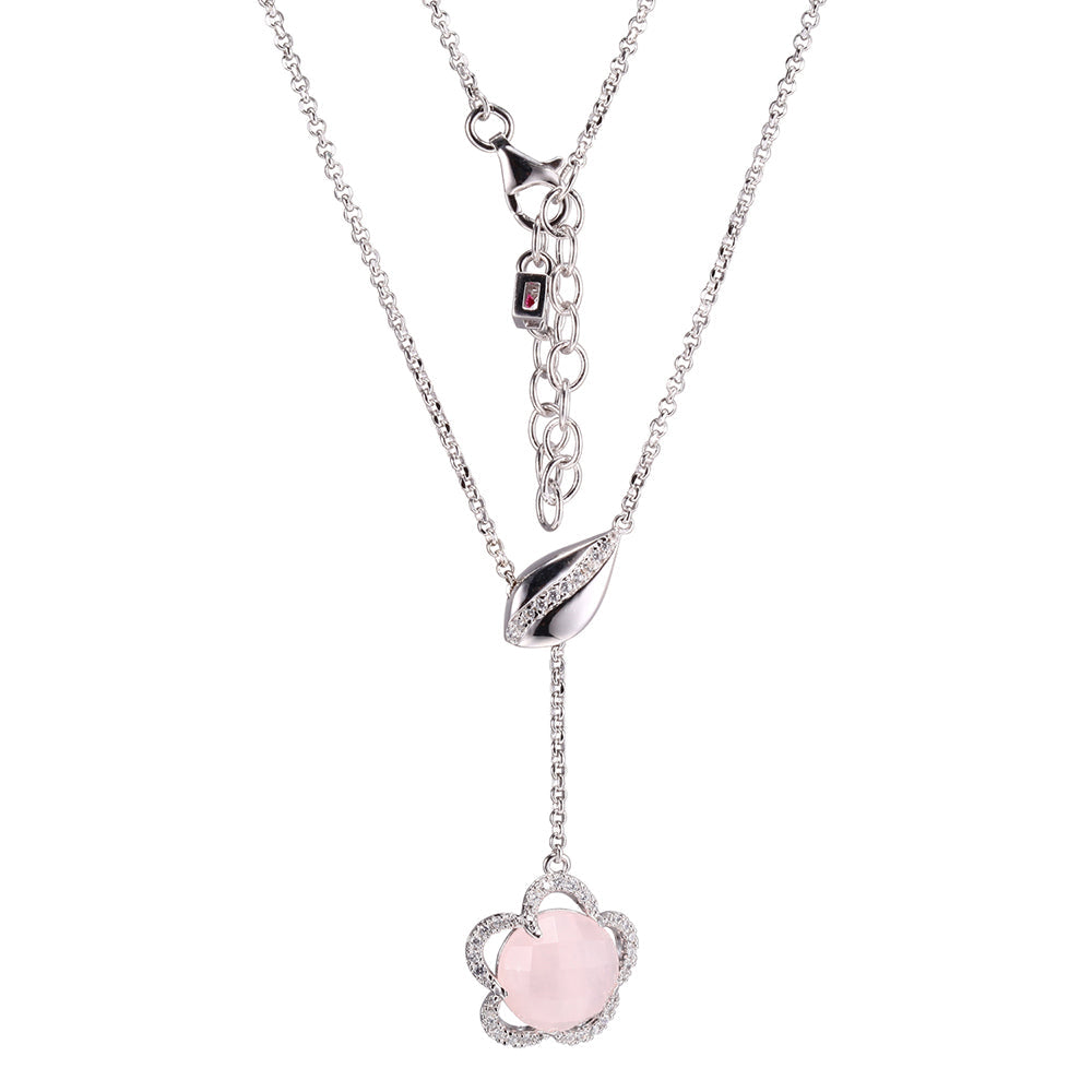 ELLE Sterling Silver Rhodium Plated Neck G Rose Quartz(A) (F-C)Rd 10mm and 3A CZ Rd 1.55mm Facted Rolo Chain 18" Extension 2"