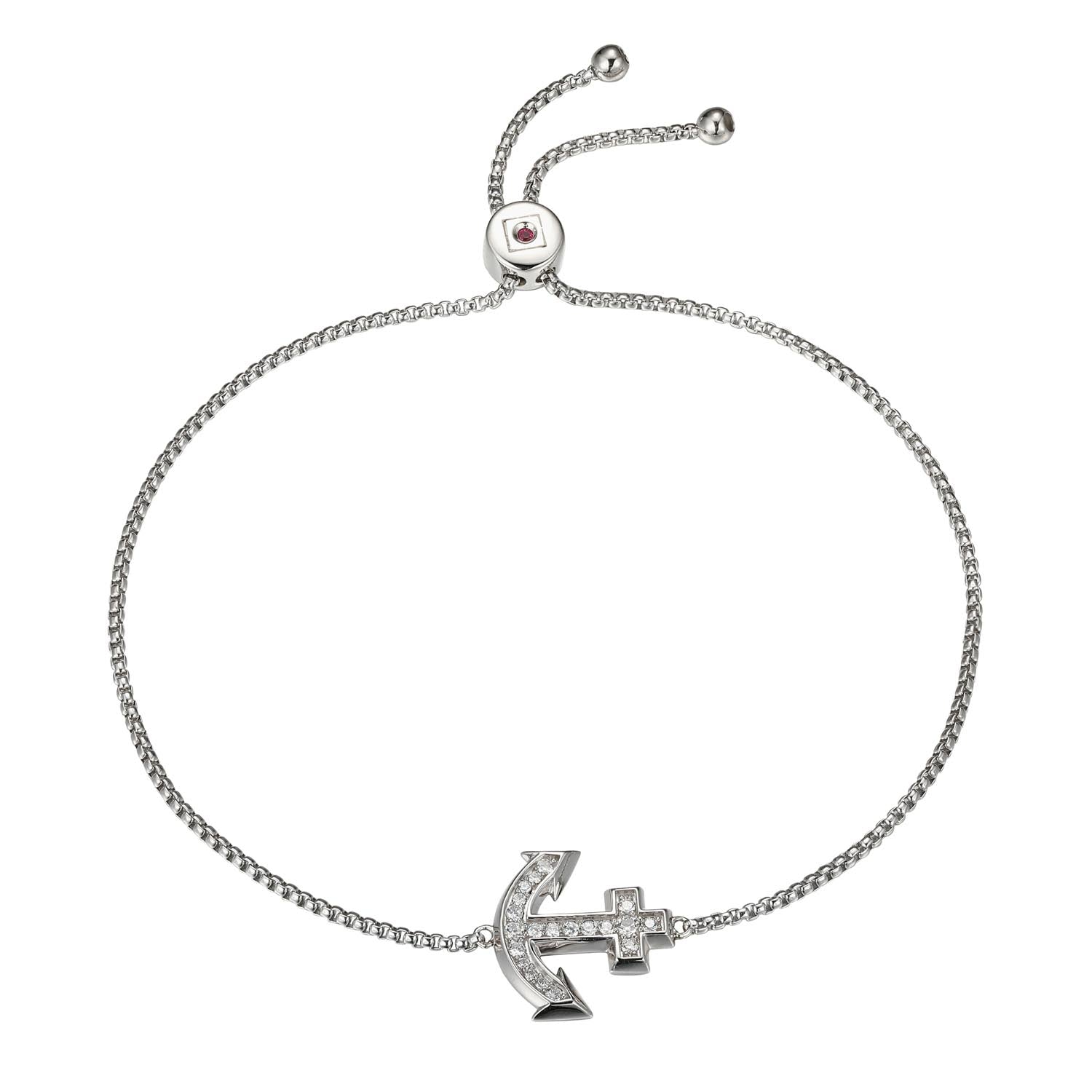 Sterling Silver Bolo Bracelet with CZ Anchor (14X14mm), Circumference Up To 9", Rhodium Plated