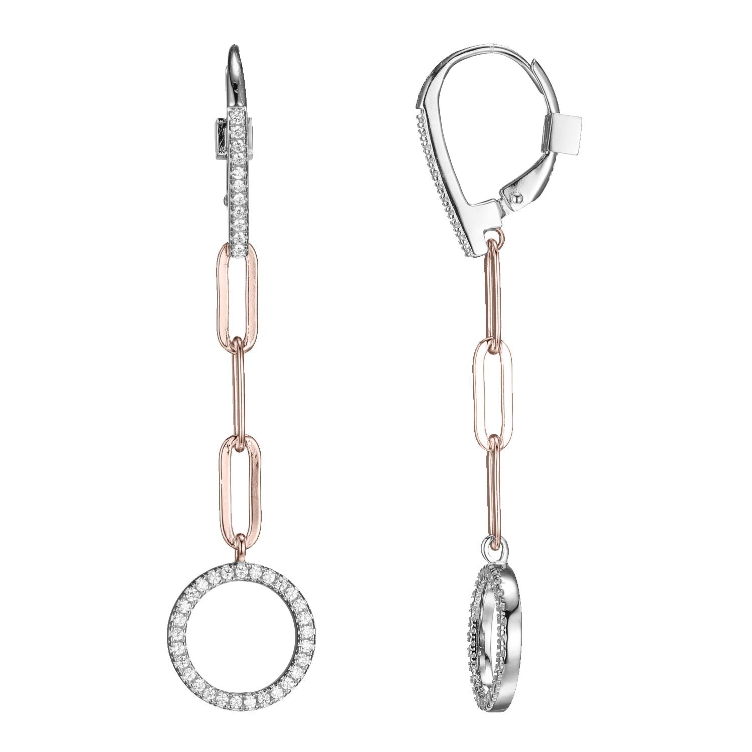 Sterling Silver Drop Earrings with 3mm Paperclip Chain and CZ Circle (12mm), 2 Tone, Rose Gold and Rhodium Plated