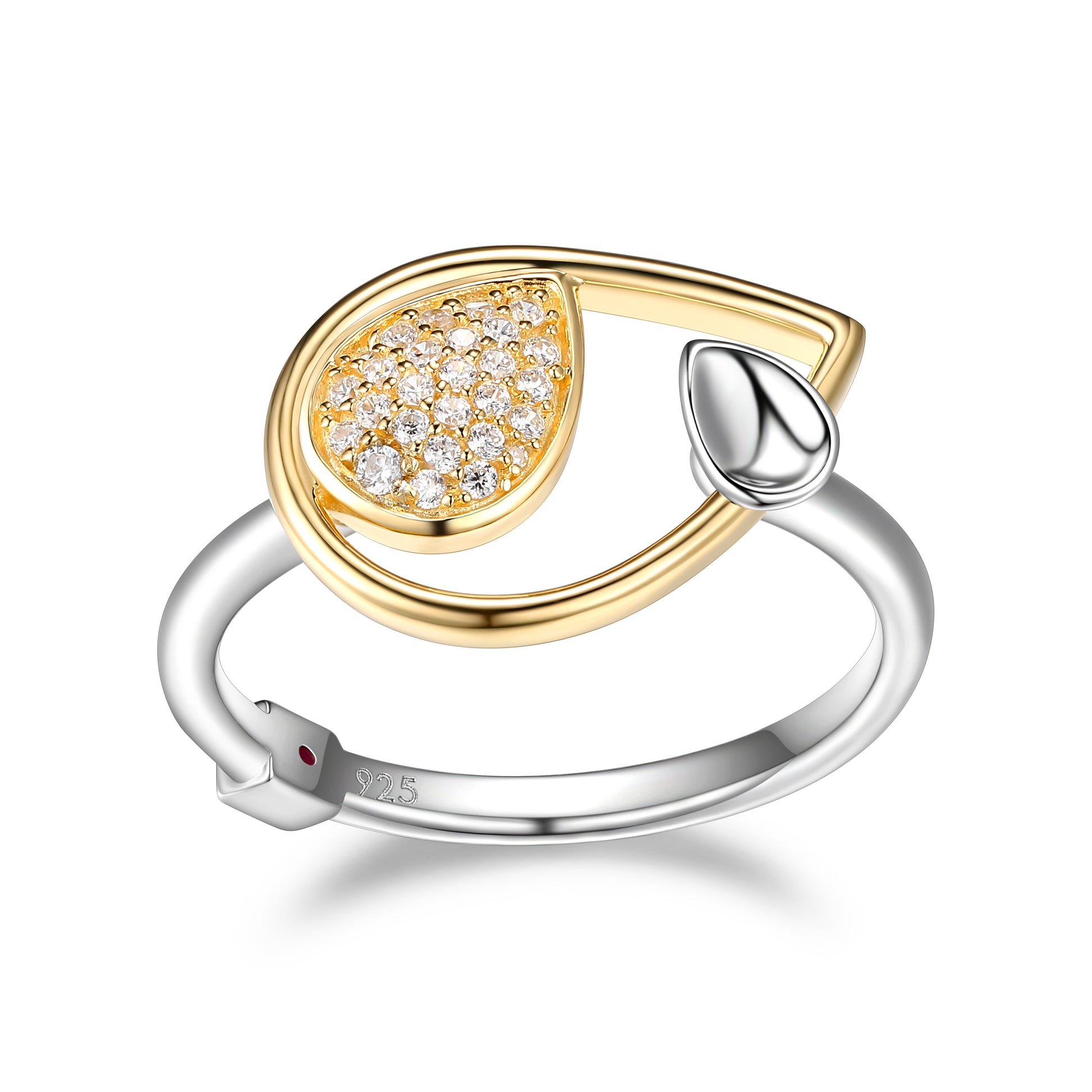 Sterling Silver Ring with Pear Shape (16X11.5mm) and Pave CZ, 2 Tone, Rhodium and 18K Yellow Gold Plated