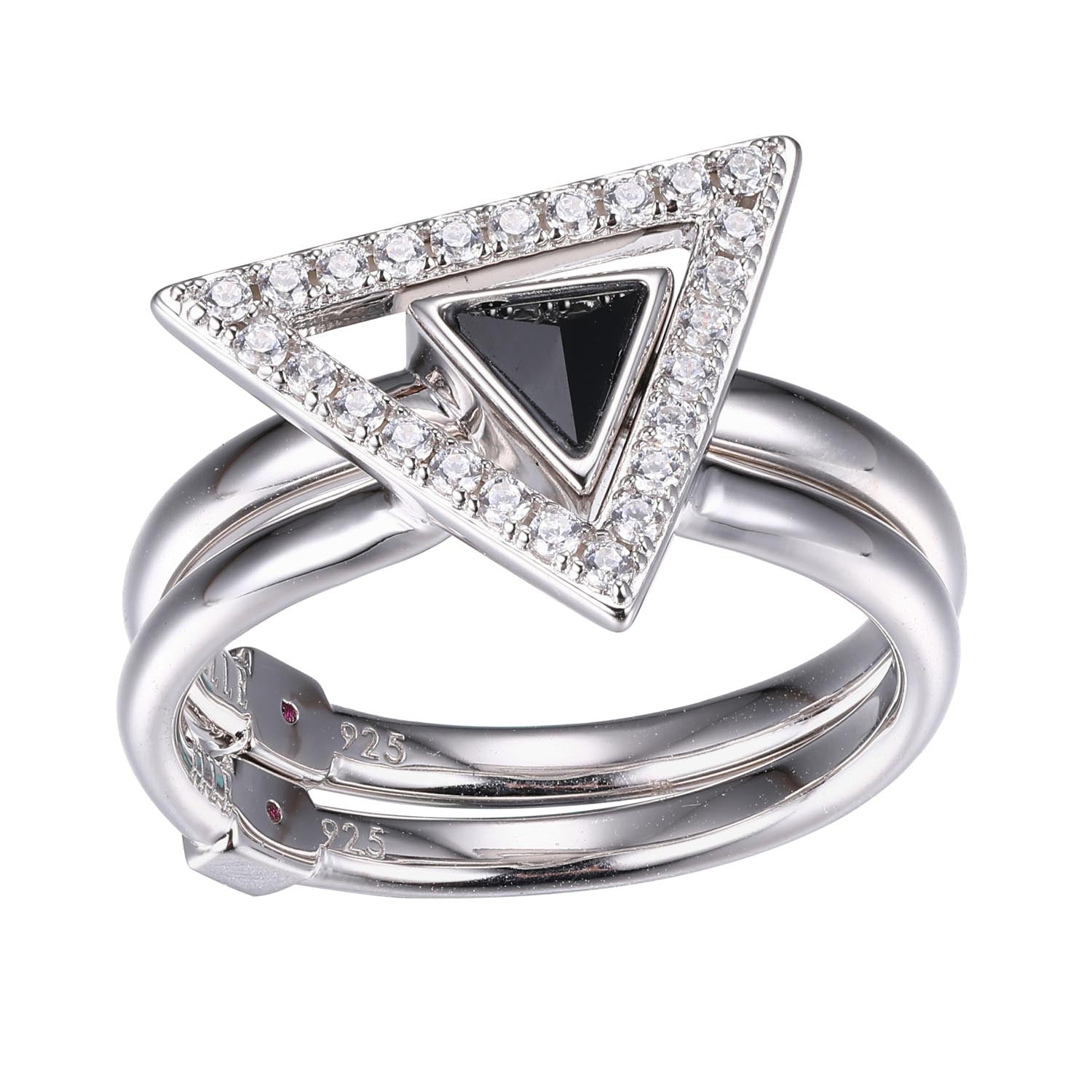 Sterling Silver Ring, Set of 2 Genuine Black Agate (4X2mm) and Pave CZ Duet, Rhodium Plated